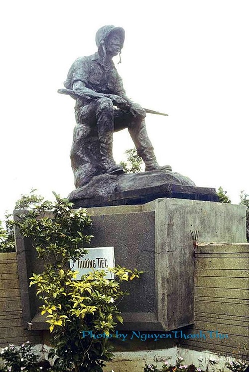 Trên không gian rộng thoáng, từ mọi hướng, người ta có thể nhìn thấy bức tượng cao, nổi bật trên nền trời xanh. Ðó là người lính từ chiến trường về thăm mộ đồng đội, quân phục, ba-lô lấm bụi, súng trường gác trên hai đùi, lưỡi lê ngang hông, dây quai nón sắt buông thõng như sợi buồn rơi vào cõi vô định. Anh ngồi thẫn thờ, đôi mắt buồn nhìn xa xăm, thương tiếc cho người bạn vừa nằm xuống. Bức tượng trong bối cảnh đó trở nên có hồn hơn và nhiều chuyện linh thiêng của bức tượng đã không ngớt lưu truyền trong dân chúng lúc đó.