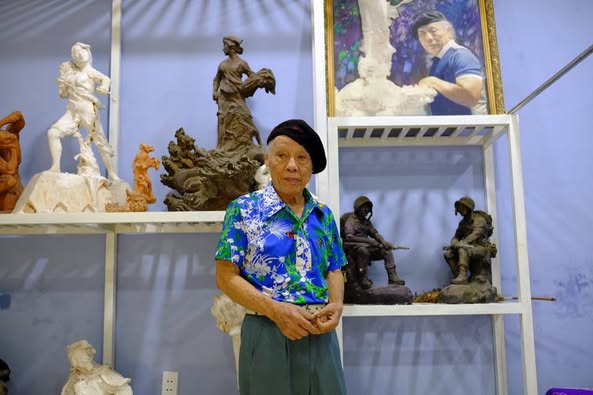 Điêu khắc gia Nguyễn Thanh Thu với các tiêu bản Thương Tiếc của mình (Hình gia đình cung cấp)