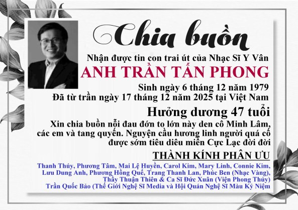 Sáng ngày 17 tháng 12 năm 2025, tôi bàng hoàng nhận được cuộc gọi từ Phúc Ben: anh Trần Tấn Phong, người con trai út của nhạc sĩ Y Vân, đã trút hơi thở cuối cùng vào lúc 10 giờ 15 phút sáng, sau một cơn bạo bệnh, hưởng thọ 47 tuổi.