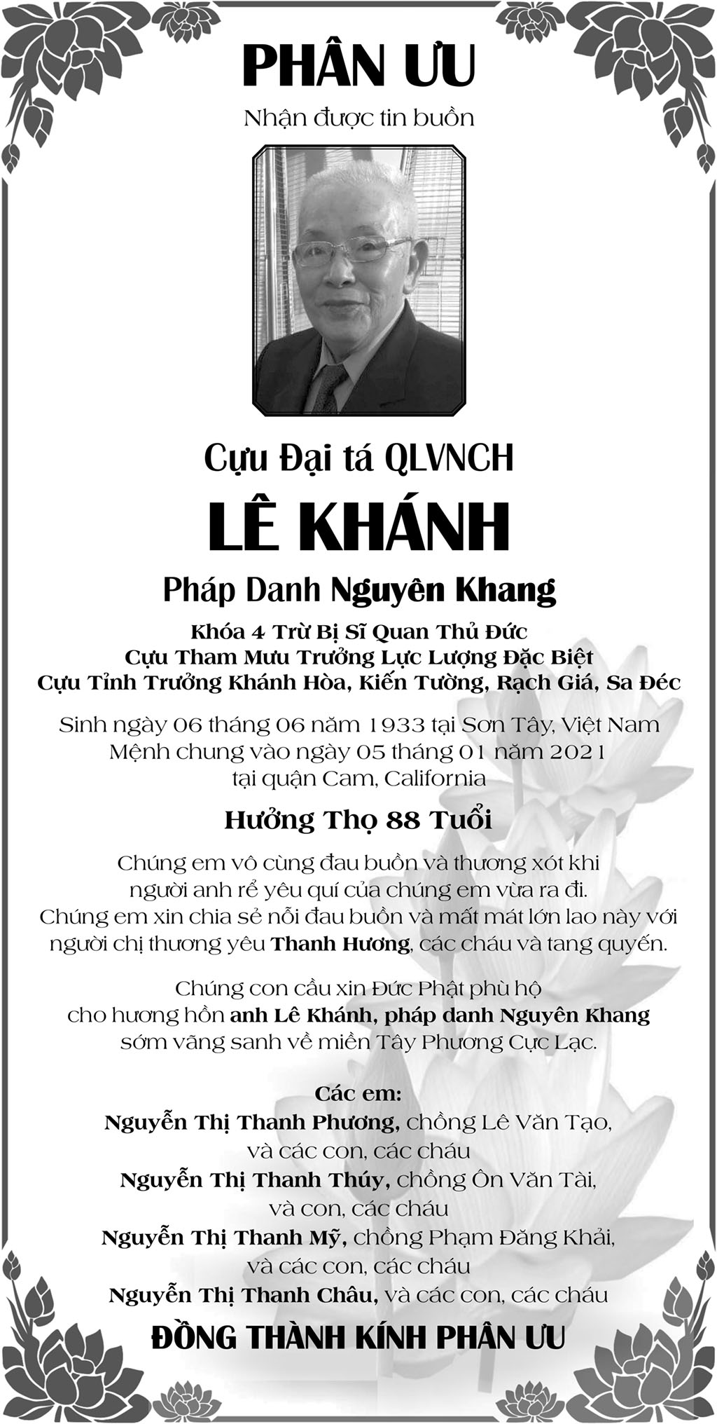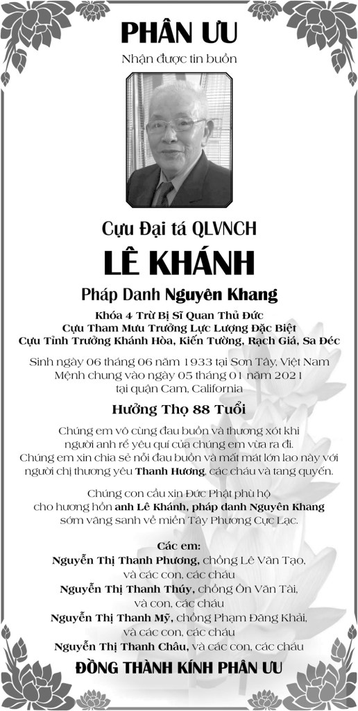 Th1 19 2021 Cáo phó – Ông Lê Khánh Thanh Thúy xin thay mặt toàn thể tang quyến kính báo cùng thân bằng quyến thuộc và thân hữu: Tiếp tục đọc → Chia sẻ: Bấm để gửi một liên kết tới bạn bè (Mở trong cửa sổ mới) Email Thích Đang tải...