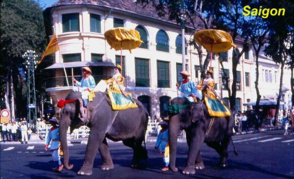 Diễn hành Lễ Hội Hai Bà Trưng trên đại lộ Catinat Thủ Đô Saìgòn 1963, (từ trái): Trưng Trắc (Phạm Liễu Chi, Gia Long) & Trưng Nhị (Vũ thị Thoa, Trưng Vương)