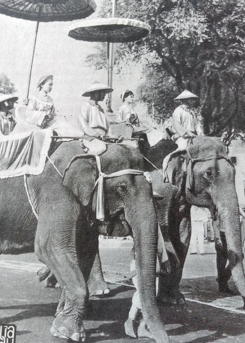 Diễn hành Lễ Hội Hai Bà Trưng trên đại lộ Catinat Thủ Đô Saìgòn 1963, (từ trái): Trưng Trắc (Phạm Liễu Chi, Gia Long) & Trưng Nhị (Vũ thị Thoa, Trưng Vương)