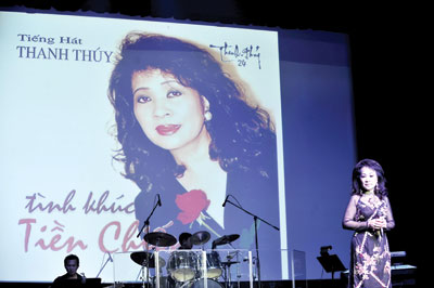 Nữ ca sĩ Thanh Thúy, trong show “Em, Anh và Chiến Tranh,” tại Little Saigon, hồi tháng 9, 2010, do nữ ca sĩ Lê Uyên tổ chức tại Saigon Performing Arts Center. (Hình: Dan Huynh)