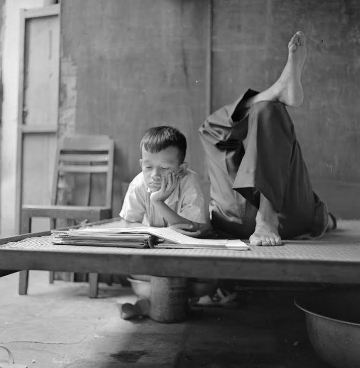 Cao Giảng năm 10 tuổi (1961) nằm đọc sách trên giường cạnh sát phòng tối dùng rửa ảnh. Cao Giảng từng là thành viên của Mây Trắng, một trong những ban nhạc được yêu mến nhất tại Saigon những năm 1973-1975