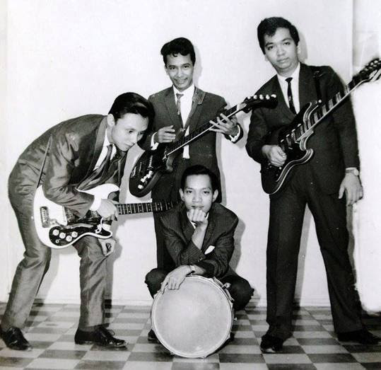Nhạc sĩ Đoàn Châu Nhi đỗ PhD in Music tại Hoa Kỳ (người ôm đàn bên trái khom người) nguyên là giáo sư dạy nhạc tại đại học ở Washington state trước khi về định cư tai Nam California. từ trái: Đoàn Châu Nhi, Dương Quang Định, Dương Quang Lê Minh, ngồi: Huỳnh Anh