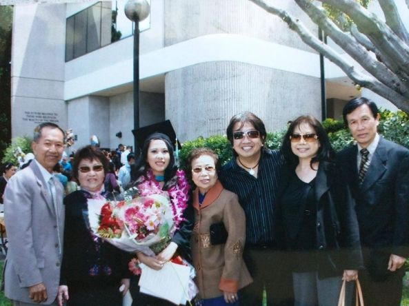 Từ trái: Anh chị Minh – Yến, Trần Hồng Ngọc, Bác Hào (Mẹ TQB), Trần Quốc Bảo, ca sĩ Kim Tuyến, Anh Hồng Vân. Ảnh chụp ngày ra trường Optometrist Dr. năm 2011.