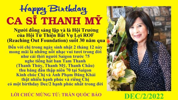 Th12 3 2022 Thanh Mỹ & Hội Từ Thiện Reaching Out Foundation – Trần Quốc Bảo Tiếp tục đọc →Chia sẻ: Bấm để gửi một liên kết tới bạn bè (Mở trong cửa sổ mới) Email Thích Đang tải...