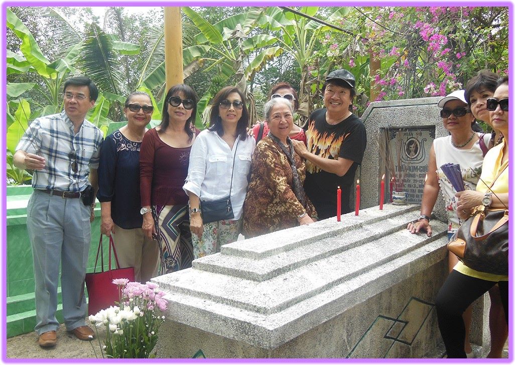 Từ trái sang phải: Anh Tuấn (chồng Phương Hồng Ngọc), chị Lan, Phương Hồng Quế, Phương Hồng Ngọc, Má Bê, Trần Quốc Bảo, Tú Trinh, Kim Anh (vợ trước nghệ sĩ T.Đ), Trang Thanh Lan chụp tại mộ nghệ sĩ Hùng Cường trưa thứ năm ngày 8 tháng 5 năm 2014 tại tỉnh Bến Tre.