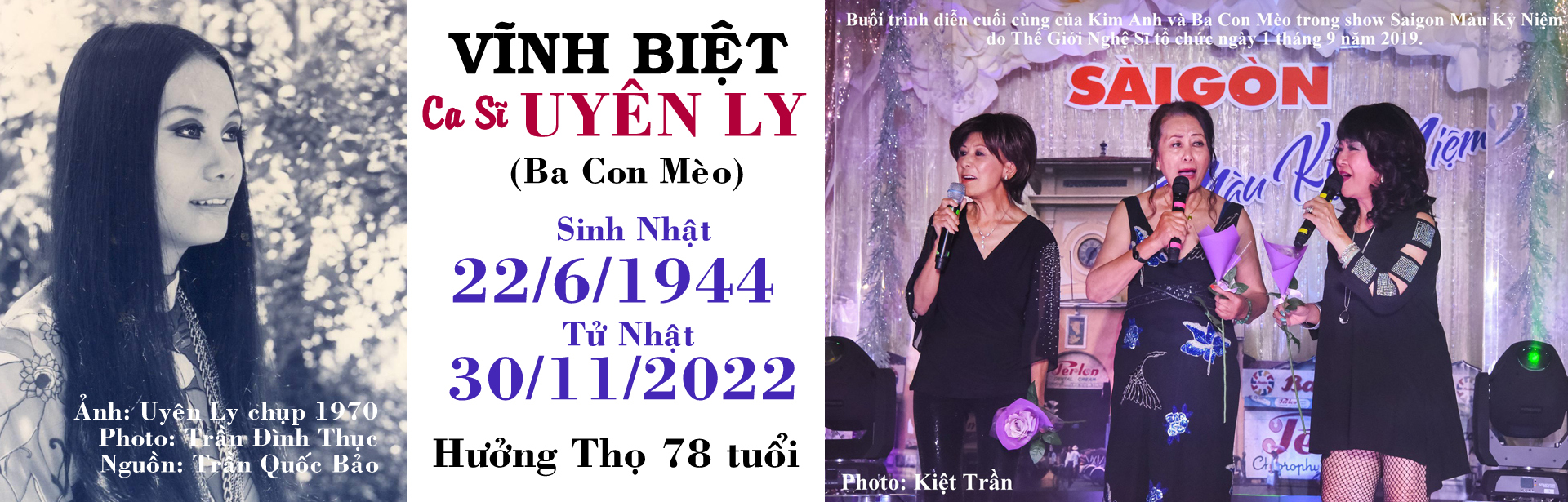 Th12 3 2022 Vĩnh biệt Ca Sĩ Uyên Ly (Ba Con Mèo) & BS Phạm Gia Cổn (Trần Quốc Bảo) Tiếp tục đọc →Chia sẻ: Bấm để gửi một liên kết tới bạn bè (Mở trong cửa sổ mới) Email Thích Đang tải...