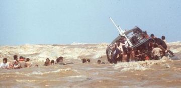 BOAT PEOPLE – Vietnamese refugees scramble from a sinking boat which they beached at Kuala Trengganu, Malaysia, in December 1978. By mid-1979, Malaysia had so many Vietnamese “boat people” that the government refused to take in more until other countries agreed to accept the refugees. (AP-Photo)